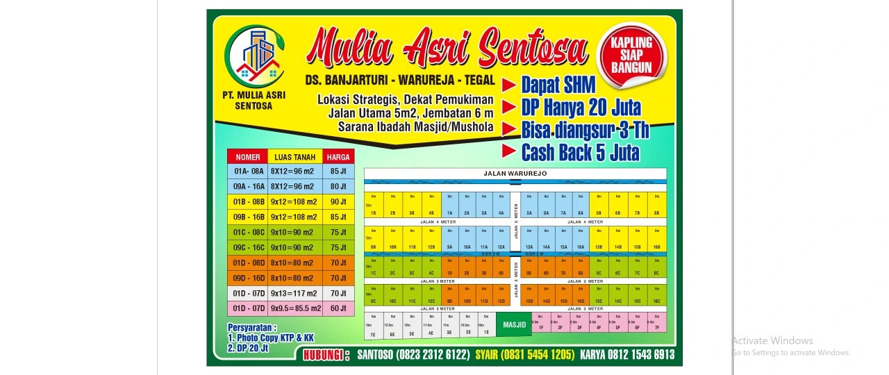 PT Mulia Asri Sentosa sejak tahun 2021 beroperasi di bidang penyediaan dan penjualan tanah kavling siap bangun untuk hunian di wilayah Kabupaten Pemalang sampai Kabupaten Tegal dan sekitarnya (termasuk penawaran dengan fasilitas umum dan opsi angsuran) Contak Person : 0831-5454-1205